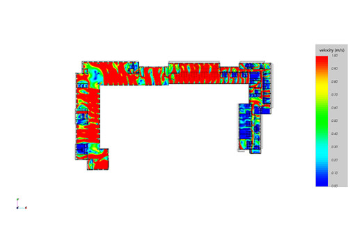 通过对本项目进行建筑室内风环境分析可知:过渡季典型工况下主要功能房间平均自然通风换气次数不小于2次/h的面积比例达到99.23%。